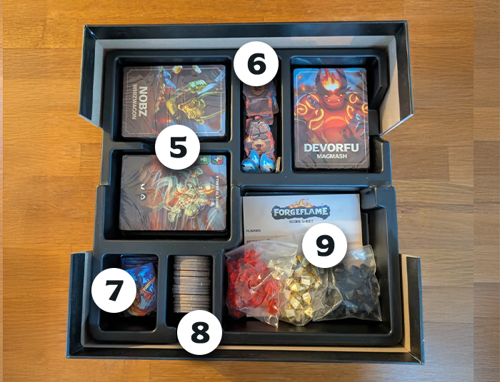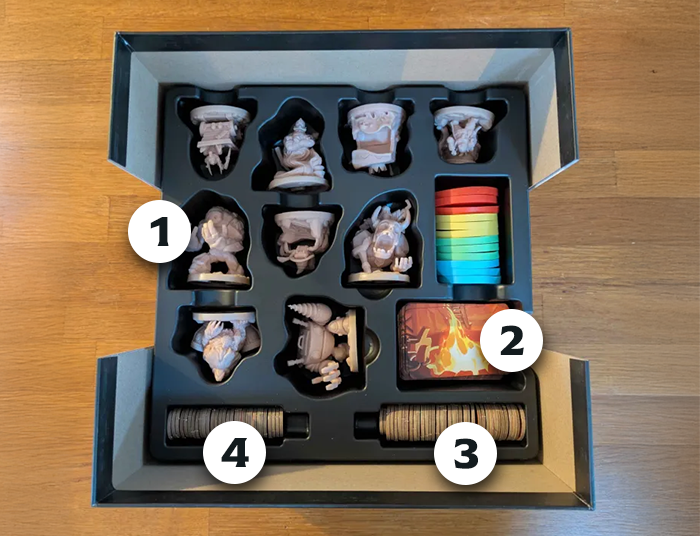 1️⃣ Store the Adventurer miniatures here. You can also place their matching tokens with them (Batteries for Flyna, Potions for Ogmul, Webs for Silkara).